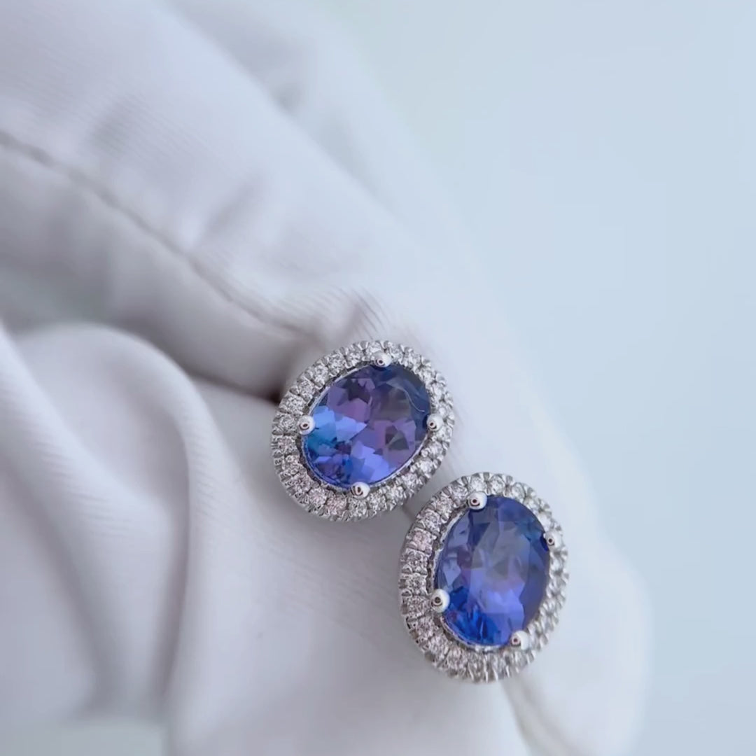 These elegant earrings highlight the deep violet-blue glow of tanzanite gemstones surrounded by brilliant round diamonds. Their classic circular halo design creates a perfect balance of color and sparkle, making them an ideal accessory for both everyday elegance and special occasions.