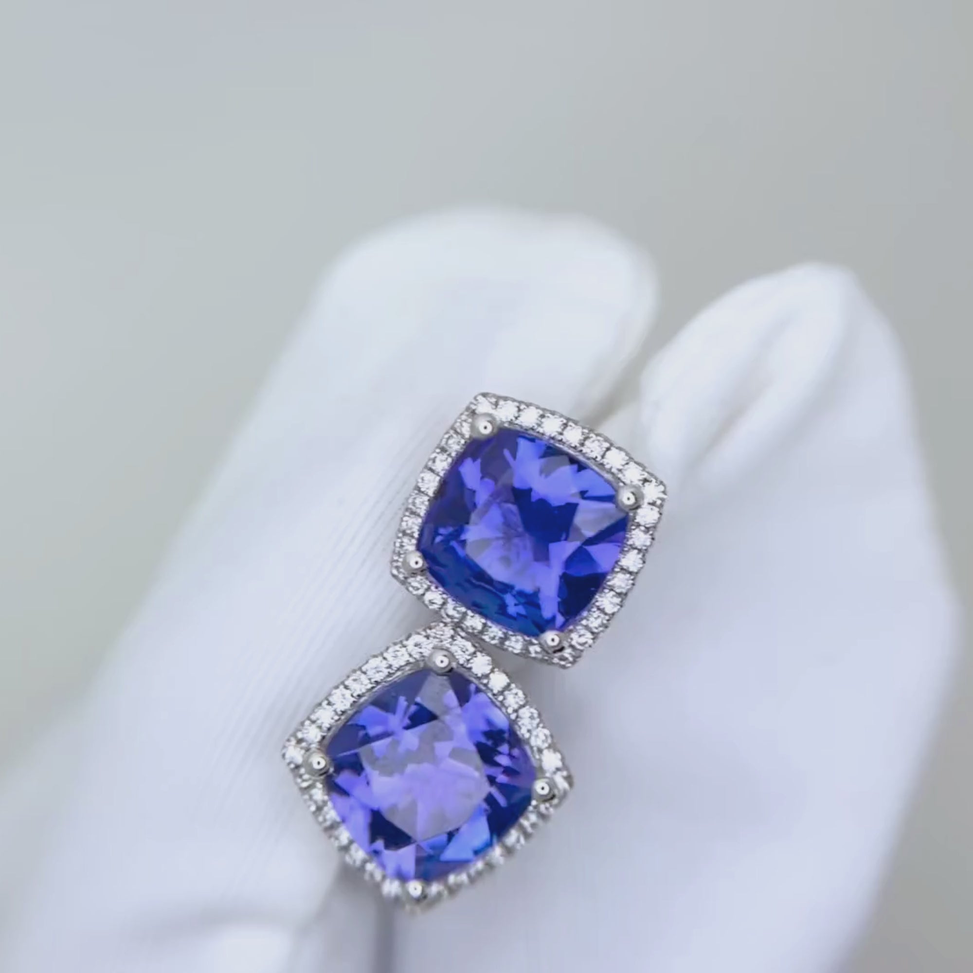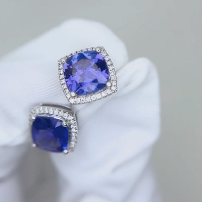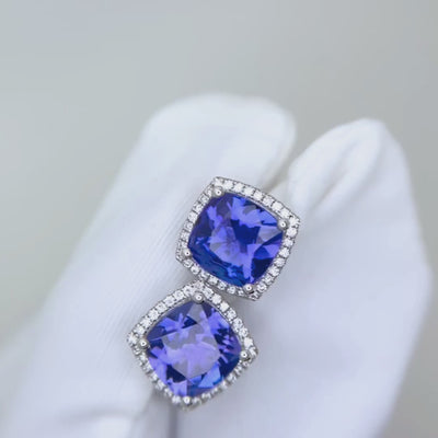 These radiant earrings feature cushion-cut tanzanite gemstones framed by a halo of sparkling diamonds. The vivid violet-blue stones exude elegance and luxury, while the refined square silhouette adds a modern touch. Perfect for adding a statement of sophistication to any outfit — from casual to formal.