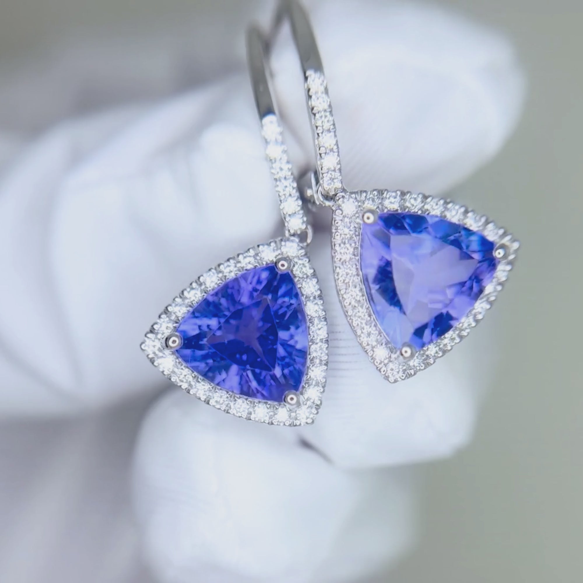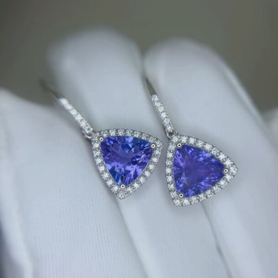 These 14K white gold earrings feature exquisite trillion-cut tanzanite gemstones, beautifully framed with a halo of brilliant round diamonds. Their vivid violet-blue sparkle and modern halo design make them a statement piece for elegant evenings or special occasions.