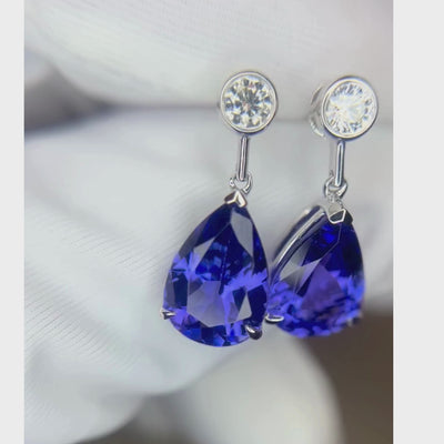 These exquisite drop earrings showcase a flawless pair of pear-shaped tanzanites weighing an impressive 4.58 carats in total. Each stone beautifully displays both violet and blue—the signature hues that make tanzanite so uniquely captivating.