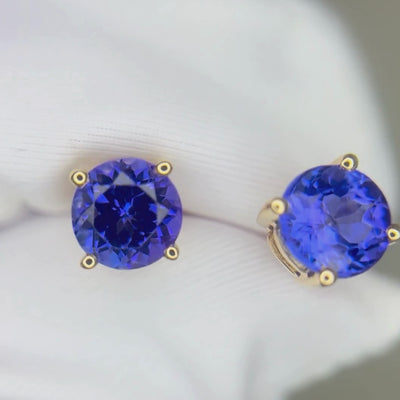 If you are looking for the brightest and most vivid tanzanite stud earrings, look no further. These stunning studs feature tanzanite gemstones of extraordinary quality, hand-selected for their remarkable depth of color and exceptional saturation. Each round-cut stone weighs just over 1.5 carats and displays an intensely rich, velvety violet-blue hue — the most prized and rarest color grade in tanzanite. (35% violet /65% blue. )It is especially difficult to find tanzanites of this dark, saturated color in smaller sizes, making stones of this calibre exceptionally rare.