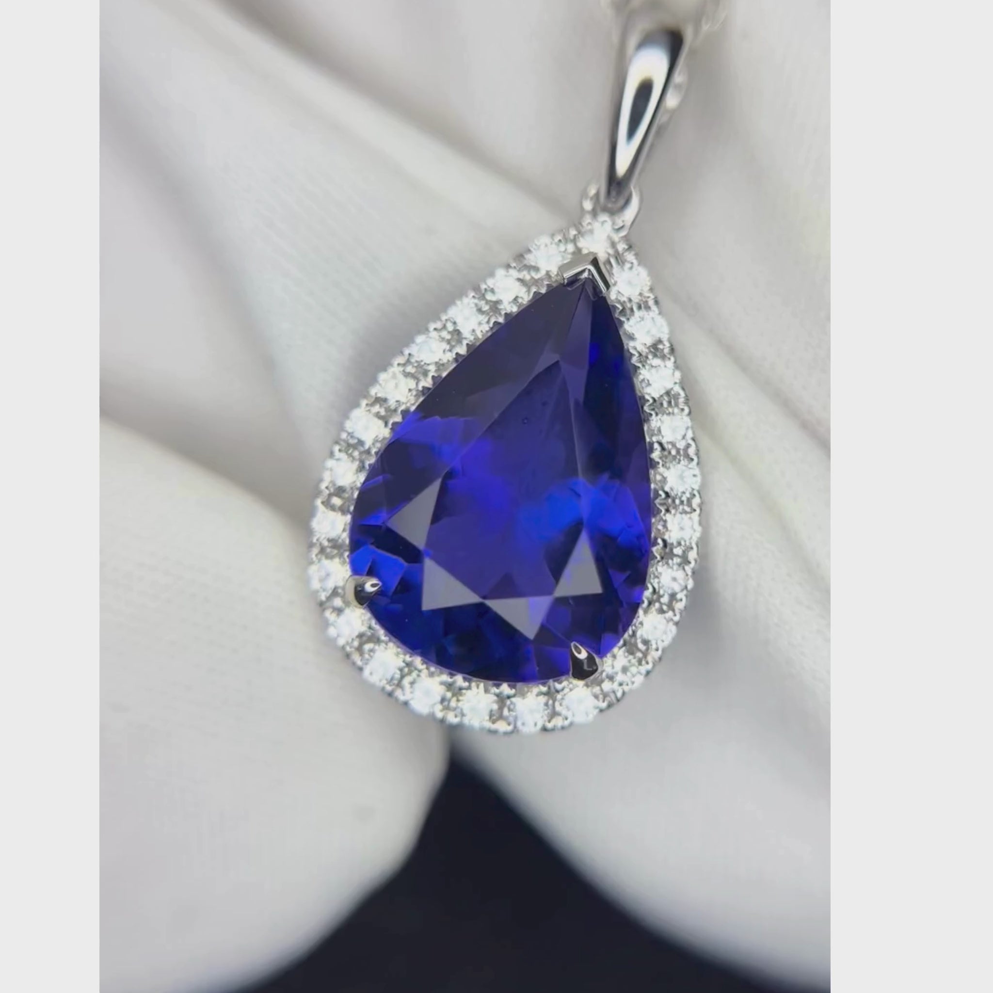 This exceptional pendant showcases a magnificent 6.22-carat pear-shaped tanzanite, celebrated for its vivid violet-blue hue and remarkable clarity. Expertly set in 18K white gold, the centerpiece is elegantly framed by nearly half a carat of fine diamonds, adding brilliance and refinement to the design.